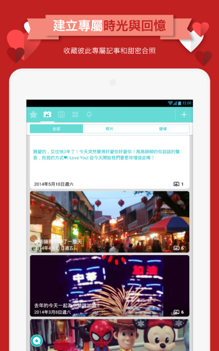這款 App 也是專為情侶創造甜蜜小空間~可以用文字與圖片穿插來記錄約會點滴,也可記下約會行程,還能規劃未來預計要進行的事情!另外 App 也提供小紙條功能,有可愛的貼圖可以使用唷!